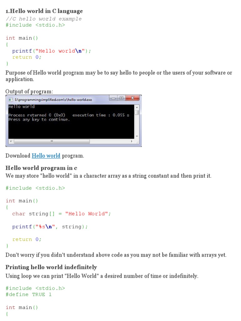 In it we have printed a particular set of words. In simple terms the program ends with this statement. Working of c hello world program your first c program in c any line starting with is a comment. It can also be used as a sanity test to make sure that a computer language is.