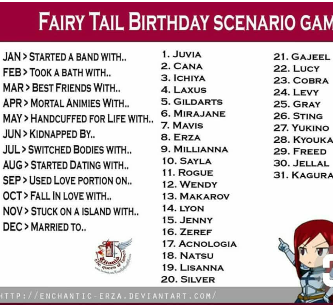 Nov 25 2016 explore abby bournes board fairy tail and birthdays on pinterest. If i see hate im sorry but bye 3 all you have to do is tell me your birthdate and youre on this list. A 14 b 16 c 14 d 7 e 7 f 5 g 9 h 7 i 4 j 12 k 11 l 18 m 19 n 8 o 4 p 4 r 13 s 14 t 4 u 3 v 6 w 7 y 4 z 6 all. 2 dont be a negative nelly.