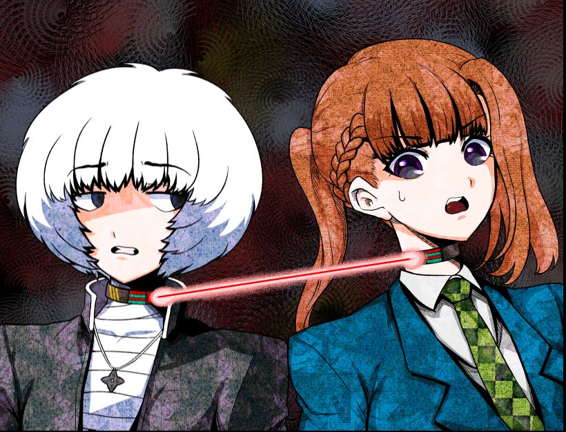 An optional and easily avoidable bad ending involving mindbreak. A few moments involving a character being stalked. Anzu is a shapely teenage girl with long blue hair with strands of pink hair that run down the sides of her face round pink eyes and pink eyebrows. Characters having hallucinations from trauma.