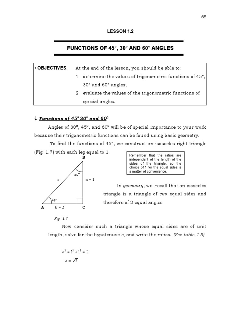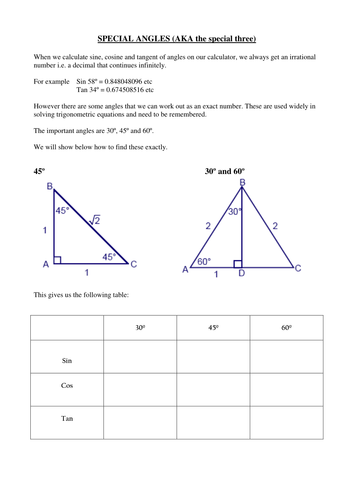 Easy way to use right triangle and label sides to find sin cos tan cot csc and sec of the special angles and of angles at multiples of 900. Provides other memory aids for the values of trigonometric ratios for these special angle values based on 30 60 90 triangles and 45 45 90 triangles. Take a right angle triangle with angles of 30 60 and 90 degrees. The second of the special angle triangles which represents the rest of the special angles to remember is slightly more complex but still straightforward.